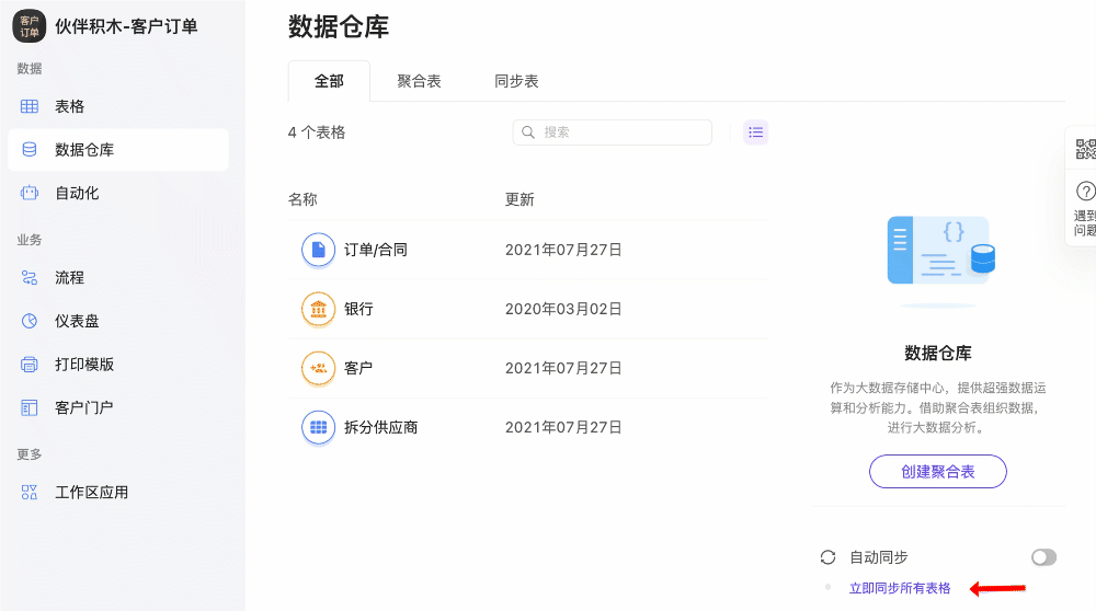 为了加速数据仓库“手动同步”的速度,给手动同步单独提供了同步服务,不再随整体同步一起,基本实现点击后可以立即同步。