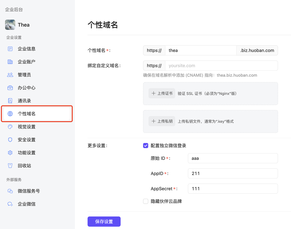 对于购买了“企业个性域名”的企业,企业管理员可在新版企业后台的“个性域名”页面自主上传独立域名相关证书文件,系统会自动解析出证书到期时间,并于证书到期前14天、7天、3天、1天给企业管理员发送站内通知及短信提醒,以免影响企业独立域名的正常使用。