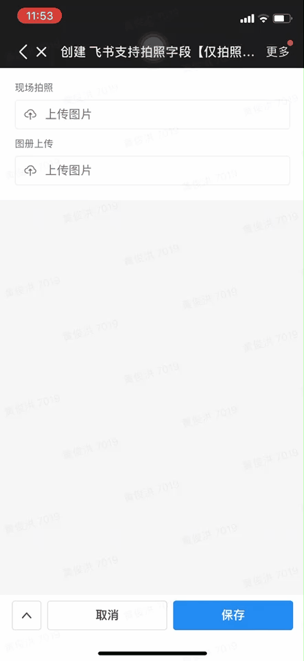 对图片字段设置了“仅拍照上传”后,在飞书环境中使用伙伴的H5版本,也可以支持只能即时拍照上传,禁止从本地相册选择的能力,可以更好的支持必须现场拍照的使用场景。
