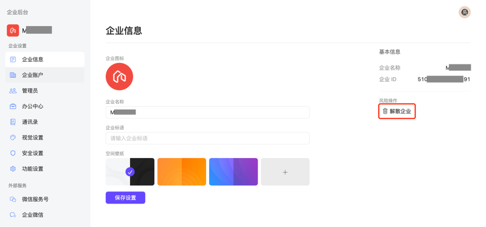 用户误创建企业、企业需要更换主体使用、迁移合并企业时,均可能遇到需要解散企业的需求,在伙伴云「新版」的企业后台中,“企业信息”页面的右侧,提供了“解散企业”的入口。