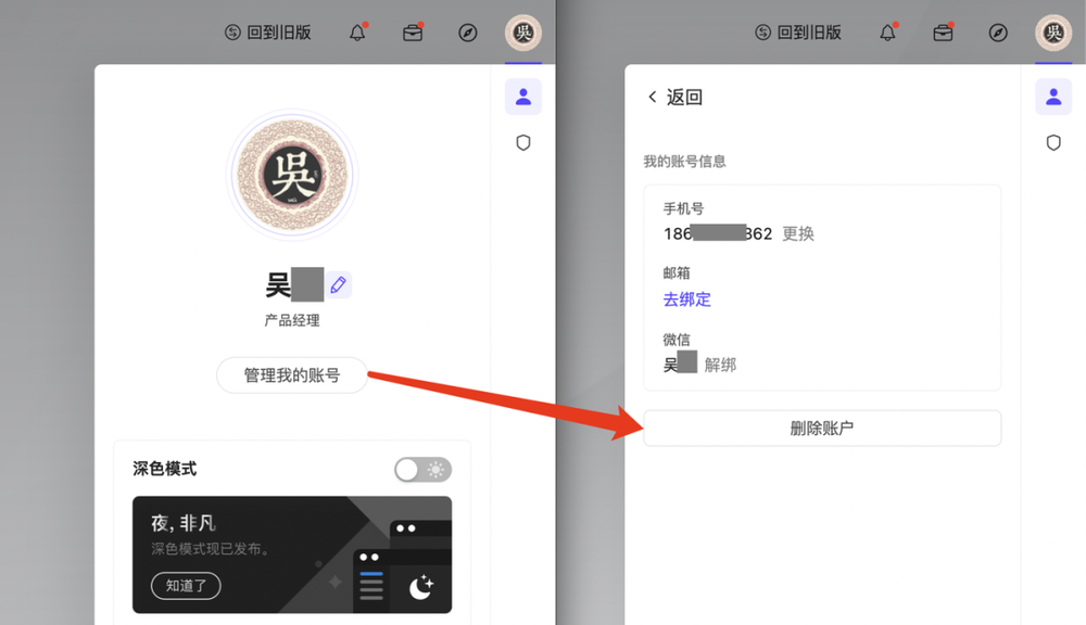 在伙伴云「新版」的个人设置中,进入“管理我的帐号”,在最底部即可看到“删除账户”的入口。