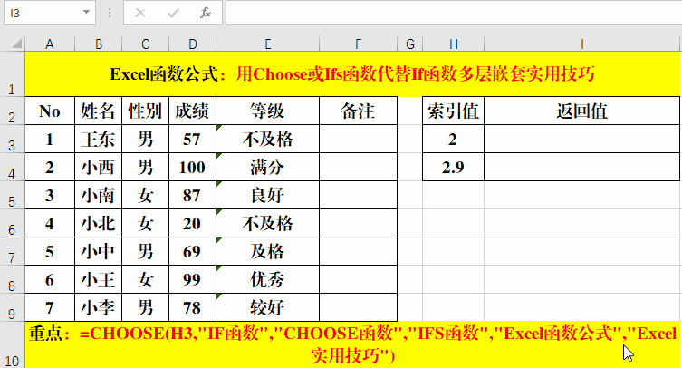 从执行结果中我们可以分析出,Choose函数的索引值为“向下取整”。而这一特点正好符合我们划分等级时的要求。