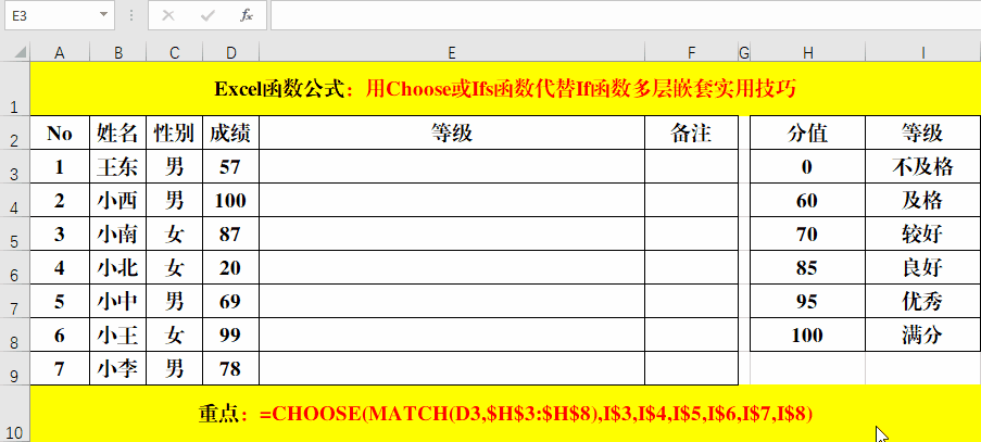 先用Match函数定位当前值在等级分值中所处的位置,然后用Choose返回返回对应的等级名称。