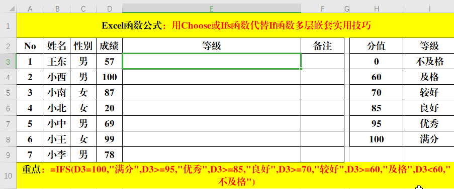 在目标单元格中输入公式:=IFS(D3=100,"满分",D3>=95,"优秀",D3>=85,"良好",D3>=70,"较好",D3>=60,"及格",D3<60,"不及格")。