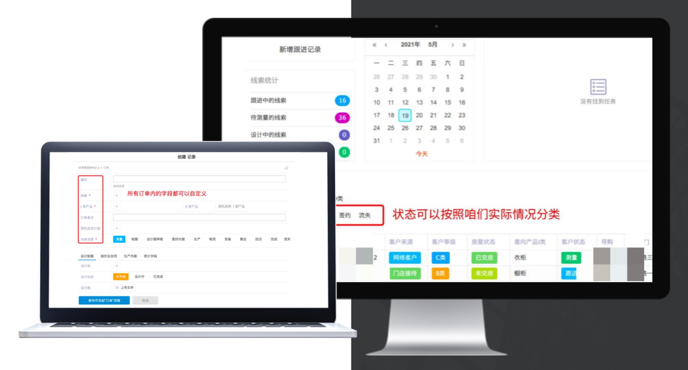 第一,订单管理: 订单录入标准化,信息查询更便捷。包括订单时间、来源分类、带单人、订单产品、销售小组及对应销售,业主基本信息等,并且可以从时间、产品、人员等不同维度进行筛选和查看。 订单状态一目了然,减轻查询压力。 订单有不同状态,包括转单,意向,退单,订单,成交,不同状态下的订单要包含其对应的关键信息。 订单完款方式灵活,交易更便捷。 订单完款分一次性支付和多次支付,系统可以记录每一次交费时间及金额及收款方、收款方式。