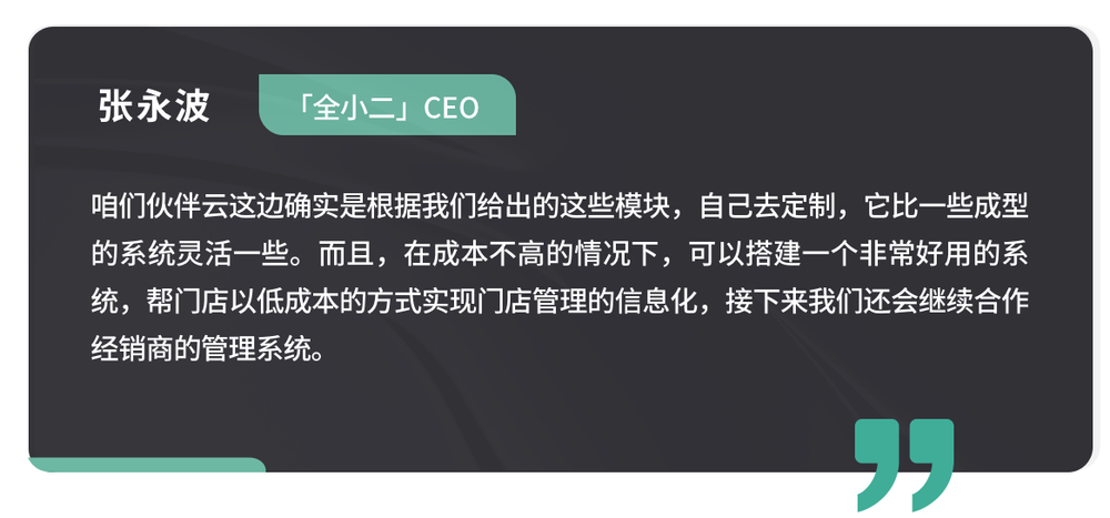 定制化订单管理:自动管理订单,生产进度实时跟进。 伙伴云基于「全小二」订单数据管理、门店业务管理等业务场景的系统搭建需求,为其量身定制个性化订单管理系统。系统上线后,不仅可以帮助经销商做订单数据管理,也能让门店跟踪到天,每天都跟进经销商的销售业绩,根据数据帮助门店复盘,从过程出发要求结果。「全小二」真正实现了企业经营管理系统大升级,成功迈出全屋定制行业数‘智’化的第一步。
