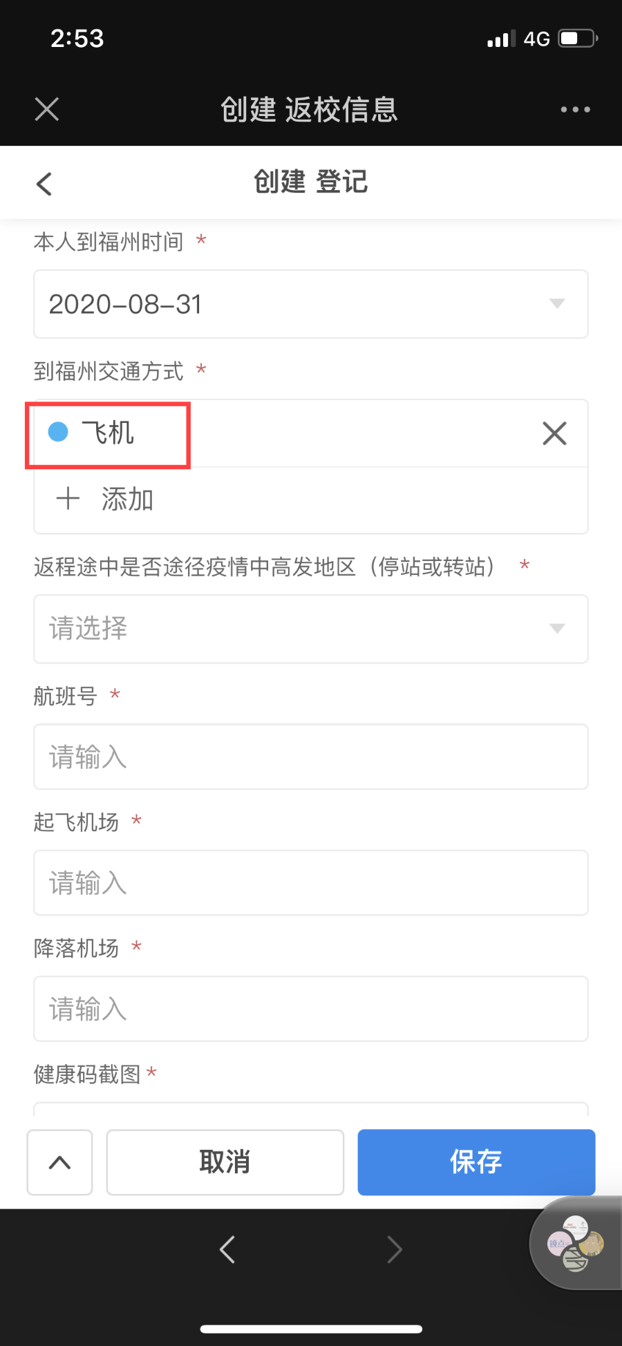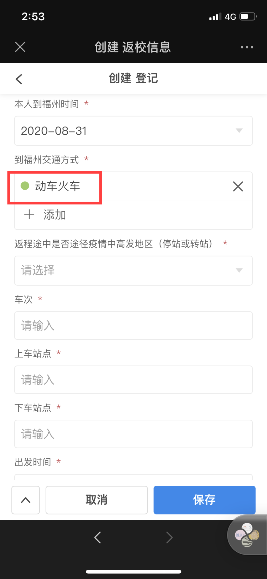 当然,也可以实现让不同学生在选择不同的出行方式时,自动带出这个出行方式需要填写的信息。
