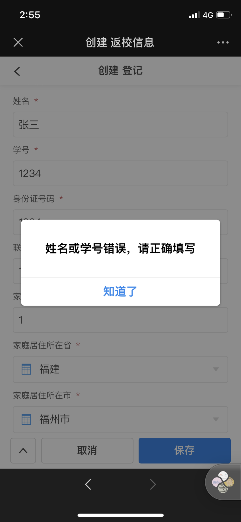 而现在,依托伙伴云强大的数据验证功能,可以让校方实现灵活的数据录入管理。比如,当学生在填报信息时,出现姓名与学号不对应时,系统会出现“姓名或学号错误,请正确填写”提示;当学生重复填报时,系统会自动弹出“您已提交过返校信息,无需再次提交……”有效提升填报效率,让数据更准确,告别手工填报汇总的烦恼。