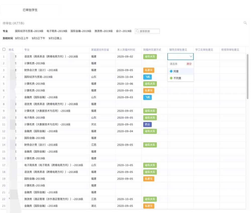 以辅导员为例,辅导员可以通过条件快速筛选,并在仪表盘中直接选择审核意见。