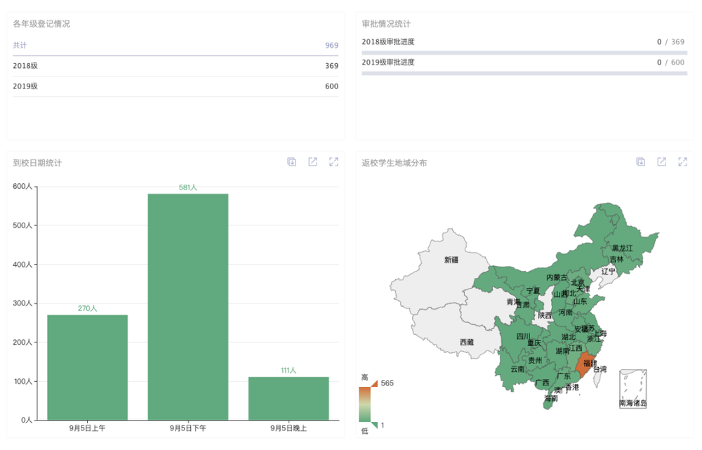 此外,伙伴云返校健康上报应用中的学生返校登记统计仪表盘,可以一键生成数据报表,清晰明了的呈现学生复学返校的统计数据,让校方精准掌握区域疫情防控数据,为有序复学提供科学决策依据。