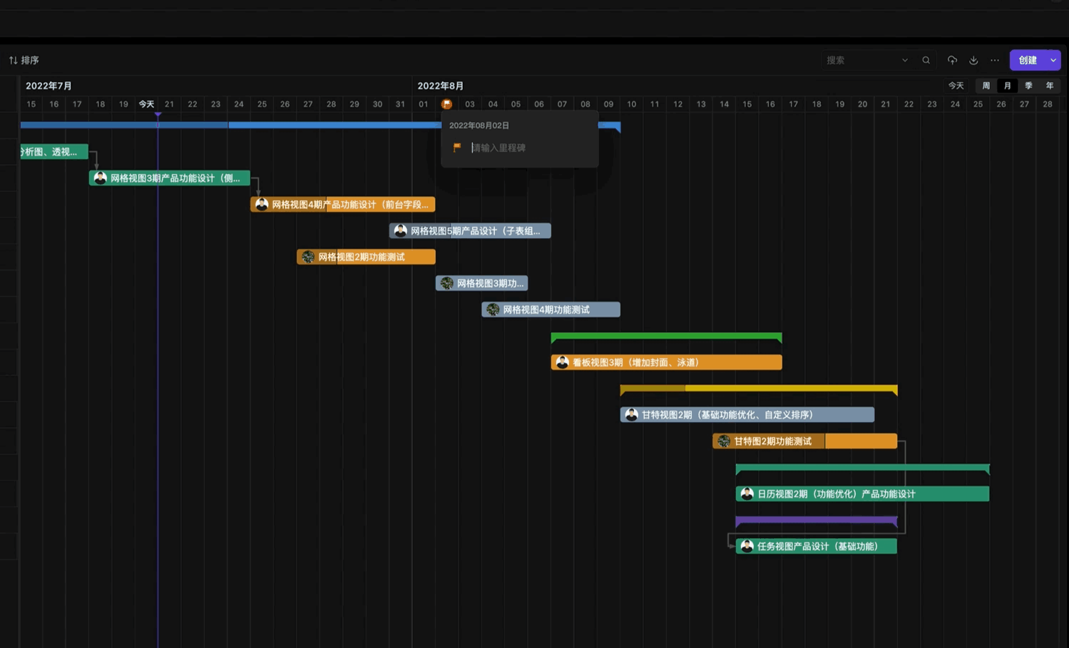 在伙伴云甘特图里,我们可以根据项目完成情况设置好阶段性的工作,每个阶段属于项目里的一个小的里程碑,到了阶段性的关键节点(里程碑)时,我们就进行及时的检查,查看项目是否在正常的轨道上进行。