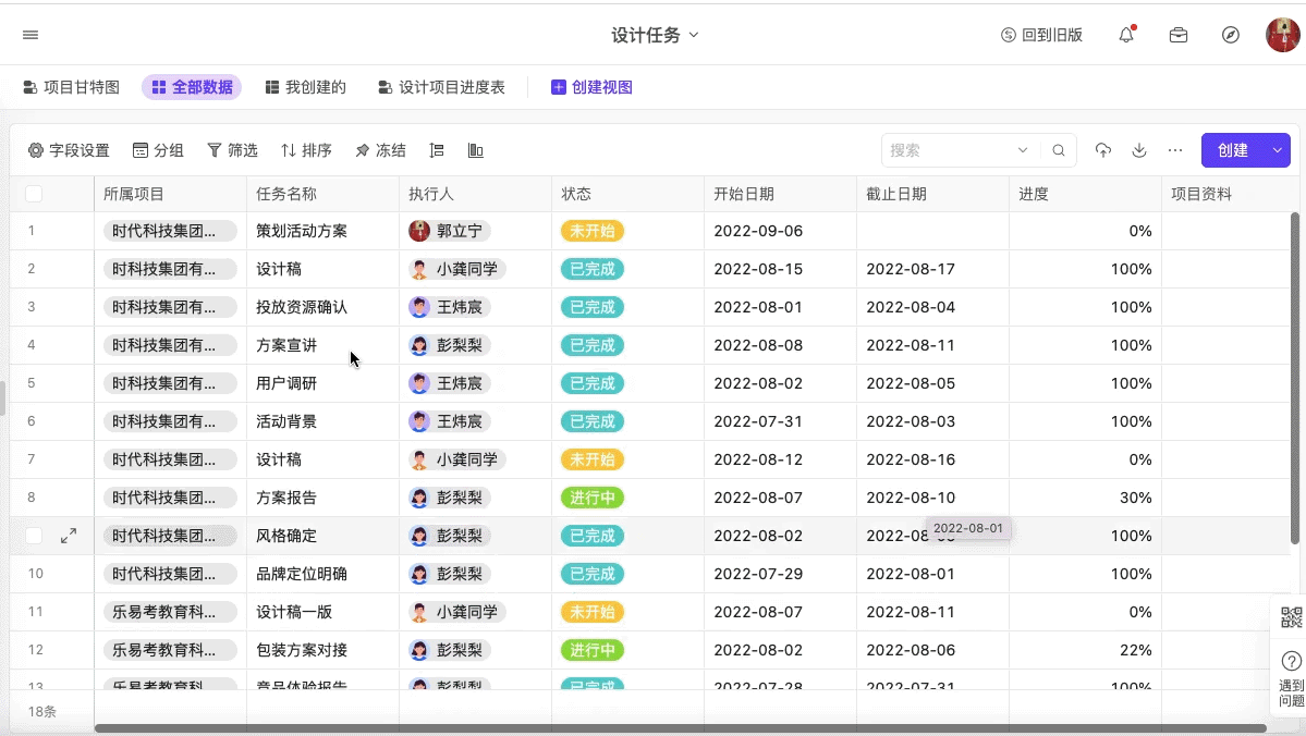 如果任务太多的时候,还可以按项目类别分组看进度,某一个项目中的哪些任务还在进行中,哪些已完成一目了然,不用到处问!