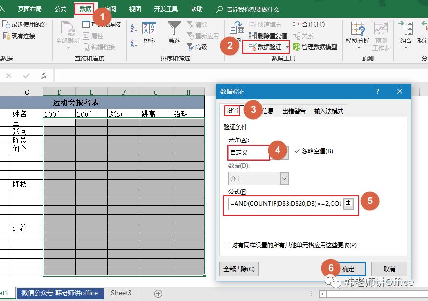 选中填写报名信息的D3:H20区域,选择【数据】——【数据验证】,在数据验证对话框【设置】选项卡中选择允许输入条件为“自定义”,输入公式: