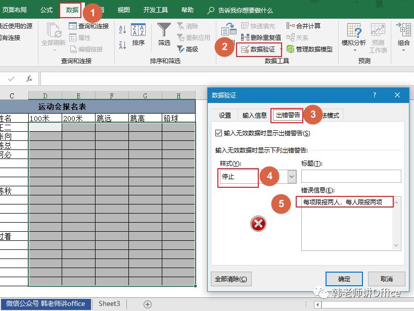 【出错警告】选项卡中选择样式为“停止”,错误信息为“每项限报两人,每人限报两项”,如下: