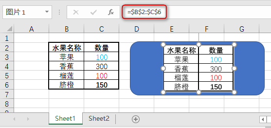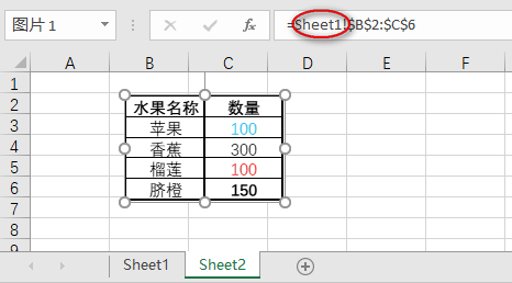 当选择图片后,查看公式栏(如下所示),会看到该图表与相应的工作表单元格区域相链接。因此,当该区域单元格中的数据更新时,图片中的数据会自动更新。