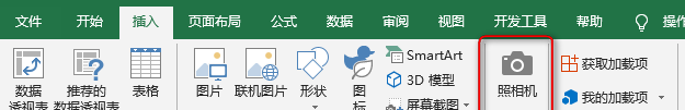 此时,在功能区“插入”选项卡中会添加一个“新建组”,其中包含了“照相机”命令,如下所示。