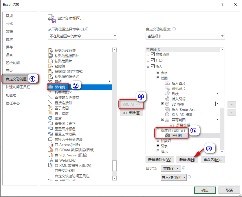 单击“文件——选项”,在“Excel选项”对话框中,选择左侧的“自定义功能区”,在“从下列位置选择命令”下拉框中,选择“不在功能区中的命令”,找到“照相机”,然后单击“新建组”,再单击“添加”命令,可以看到“照相机”被添加到了刚才新建的组中,如下所示。