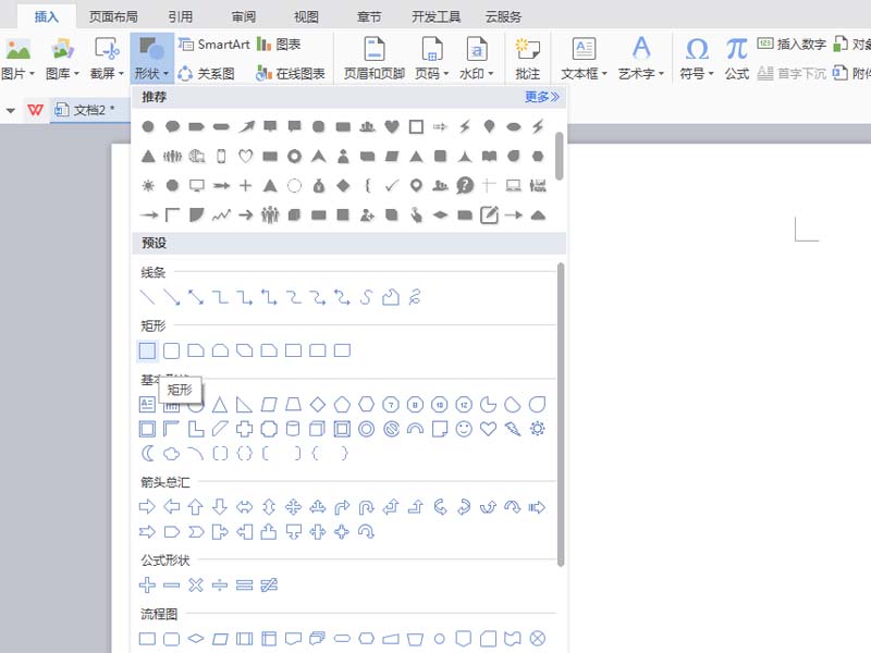 2、执行插入-形状命令,从下拉菜单中选择矩形并绘制矩形。