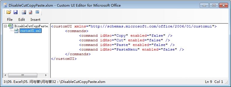 此时,需要通过XML代码定制功能区来实现禁用功能区命令。关闭工作簿并使用Custom UI Editor打开工作簿,输入下图2所示的XML代码: