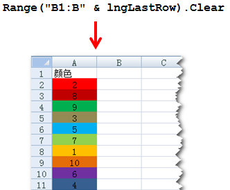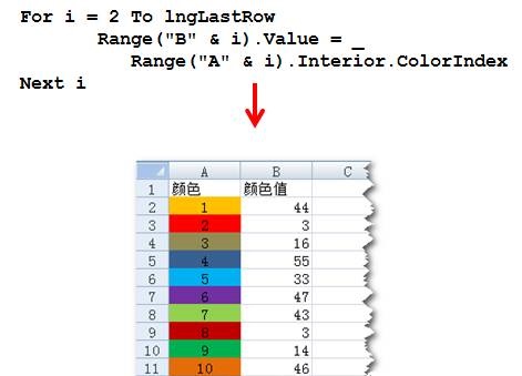 1.遍历列A中的单元格并将其背景色的颜色值放置在列B中相应的单元格。