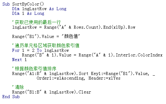 问:如何根据颜色排序?例如下图所示的工作表,要求列A根据单元格背景色来排序。