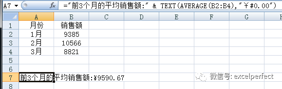 =”前3个月的平均销售额:” & TEXT(AVERAGE(B2:B4),”¥#0.00″)