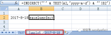 如下图所示,在工作表Sample5的单元格B2中,要获取具有与单元格A2中的值相同名称的工作表“2017-8-18”的单元格B2中的值,如果直接使用公式: