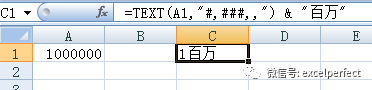 TEXT函数使用指定的数值格式将单元格A1中的值以百万为单位显示。
