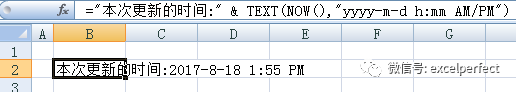 =”本次更新的时间:” & TEXT(NOW(),”yyyy-m-dh:mm AM/PM”)
