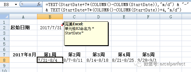有时候,给定起始日期后,要计算其后的一系列日期。在本例中,给定接近2017年8月的星期一的日期,如单元格B2中的“2017-7-31”,要求得到8月每周工作日的日期区间,例如第1周为“7/31-8/4”。在单元格B8的中公式为: