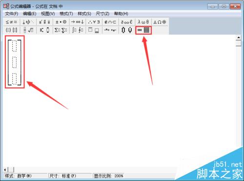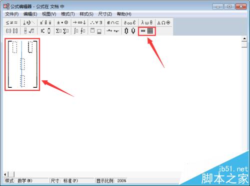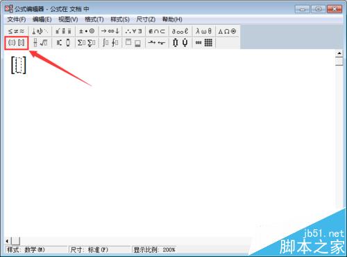 3、如果我们要输入一个3*2的矩阵,那么首先要在打开的公式窗口菜单栏中找到围栏模板,如图所示,上边显示的是一个小括号和中括号的图样,我们在其中找到中括号的图样
