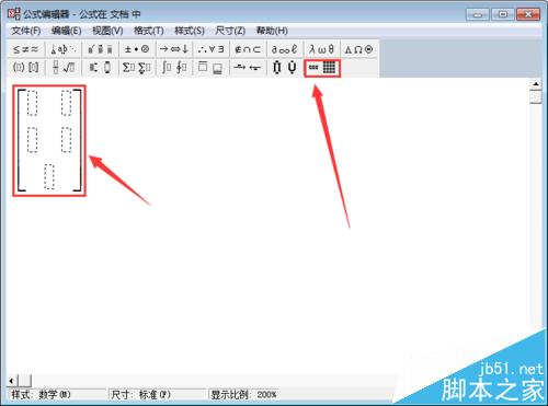5、选中第一个输入框,再在矩阵模板中找到一个1*2的矩阵模板,插入,出现下图的样子