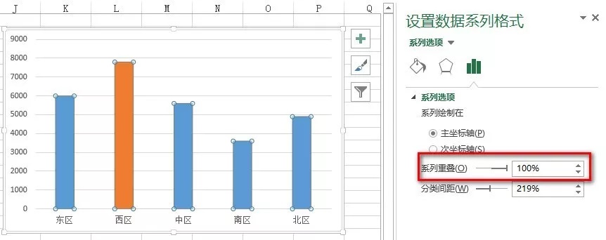 选择图表系列,按Ctrl+1组合键调出“设置数据系列格式”界面,将系列重叠设置为100%,如下图5所示。