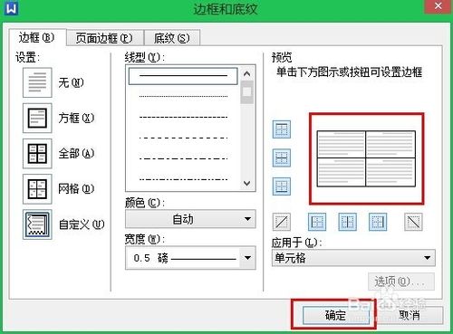 12、我们选择”边框和底纹“进入,边框设置为”无“然后直接单击确定。回到文档时,发现所有的单元格也都没有边框了,这时,我们再一次进入表格属性中边框和底纹,我们依旧选择”无“,但预览侧我们将”上中下“和”左中右“六条线段选上。下方的”应用于“,选择”单元格“。最后单击确定。