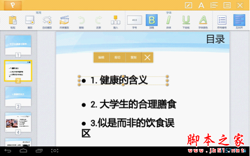 运行WPS移动版,打开带有“PPT”或“PPTX”桔黄色标识的PPT文稿,或者进入“金山快盘”在线读取PPT演示文件。此时除了可以播放PPT文稿外,还可以直接在WPS移动版中进行编辑,诸如加入或修改文字内容,更改段落格式,以及插入图片等都能轻松实现。