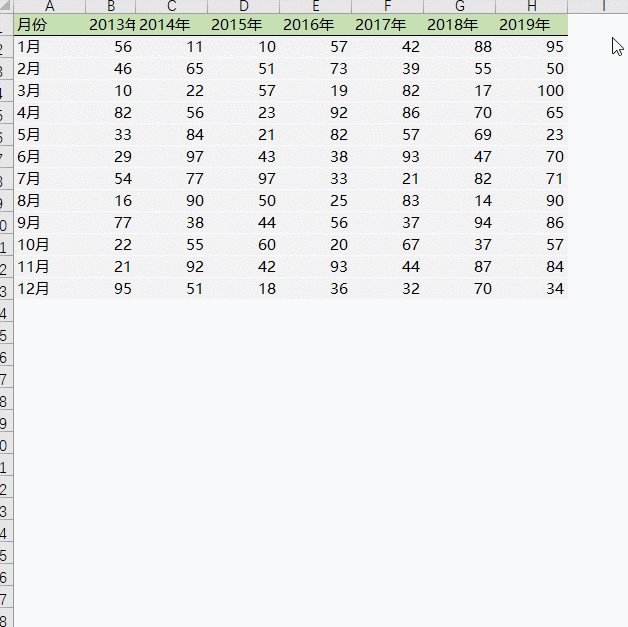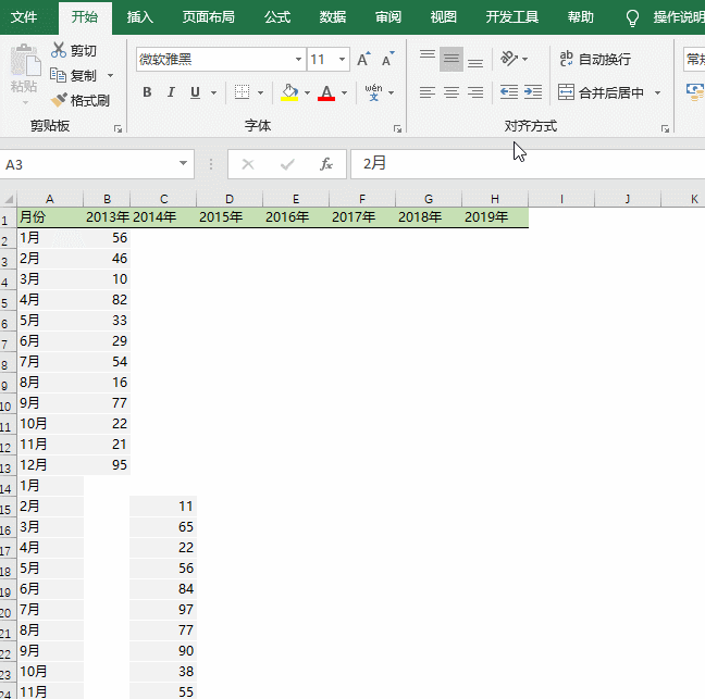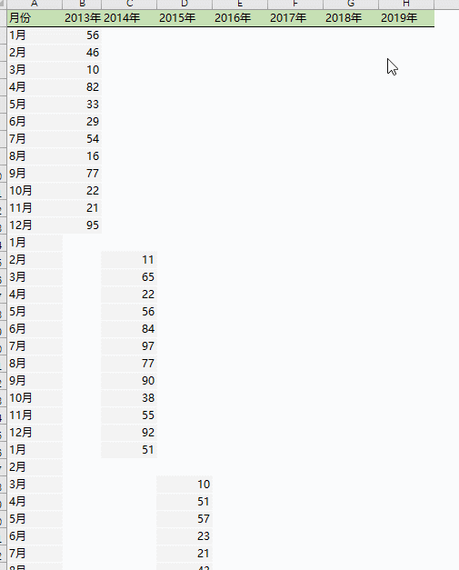把数据向下拖,把每年的数据上下分开显示,中间留一空行