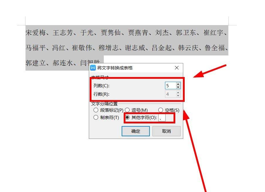 5、出现将文字转换成表格对对话框,将列数处该为自己所需要的列数,将文字分隔位置处选择“、”(顿号),完成后单击“确定”