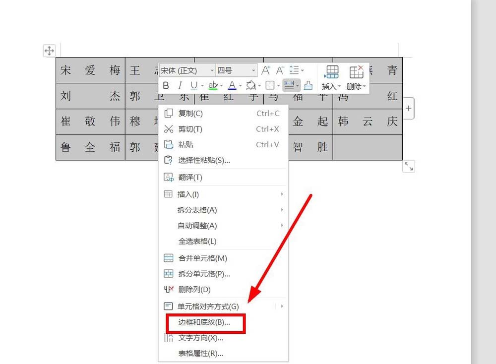 7、选中表格,鼠标右键,在右键菜单找到“边框和底纹”单击