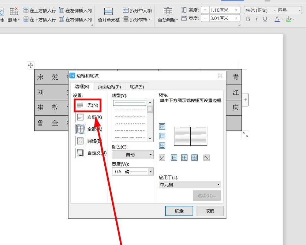 8、选中“边框”选项卡单击,在下边选项中选中“无”单击即可