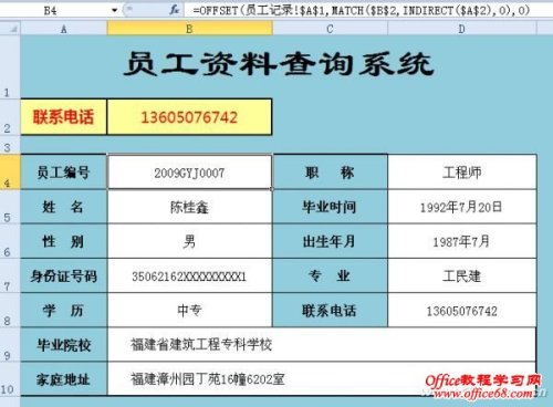 一般情况下,需要对员工记录、产品记录、合同记录、学生成绩列表记录等经常查询的记录做一个查询界面,通过输入员工编号、姓名、合同编号、产品型号等简单文本,即可快速查询到需要的记录。在Excel2010中,大家通常使用VLOOKUP函数来做查询接口,但是VLOOKUP只能根据记录表中的第一列进行查询。在实际使用中,由于已知的查询条件不同,经常需要随时选择不同的列进行查询。就员工记录而言,除了通过员工编号进行查询外,有时还需要通过姓名、身份证号码和联系电话进行查询。那么我们如何通过可选列进行查询呢?本文以员工记录表的查询为例,介绍了两种方法。