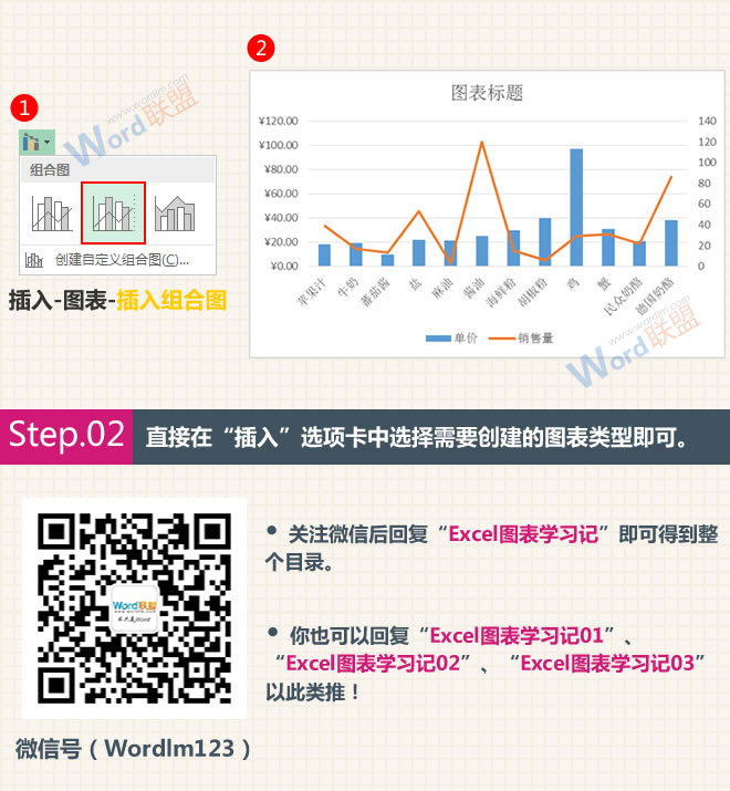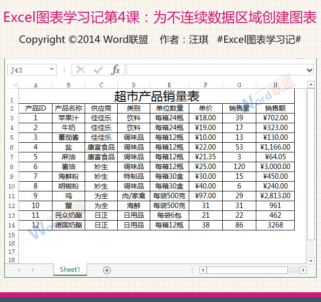 就像上图中的表格一样,假设我们只需要为三列数据创建一个图表:产品名称、单价和销售量。我们做什么呢让我们来看看王琦老师是如何做到的。