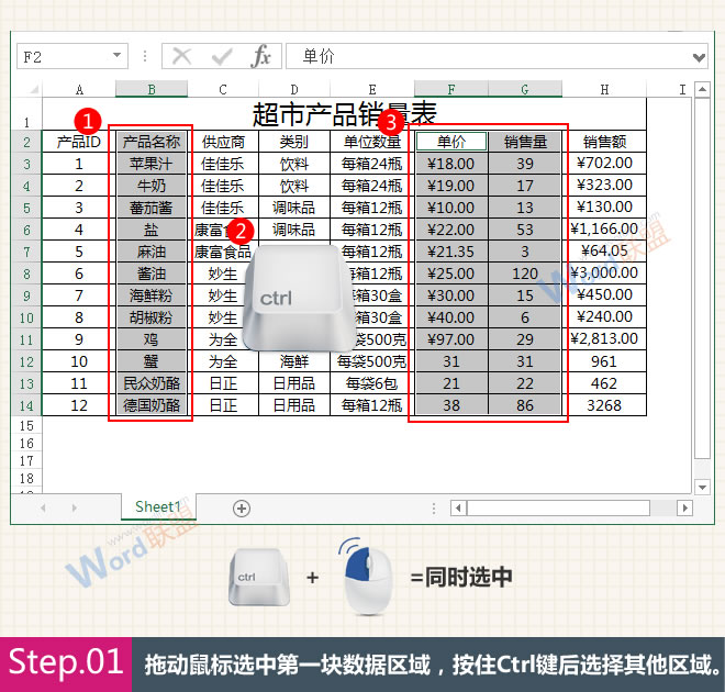 1.拖动鼠标选择产品名称列,然后按住Ctrl键并继续选择第二个数据区域。提示:按住Ctrl键可以同时选择多个数据区域。