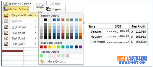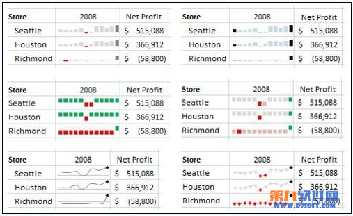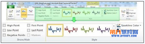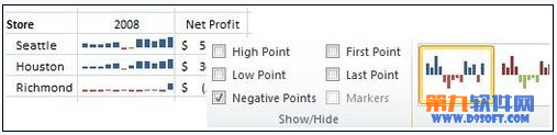2、波型图有一个与图表和表相似的库,可以在其中快速选择颜色方案。波型图的一些独特的选项在显示/隐藏组中,可以激活点。选中某个点选项将开启或高亮显示每个波型图中的该点,因此,如果开启高点,那么对于折线波型图来说,将获得每个波型图中的高点。对于柱状图和盈亏图,代表高点的点将被格式化与其它点不同。如果与高点有关,都将被高亮显示。负点将开启或高Excel怎样格式化本文波型图亮显示波型图中的负点,如果开启示例波型图中的负点,则得到如下图的结果: