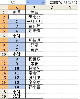 回车后拖动填充柄向下填充公式即可。这样,不仅编号连续,而且以后在B列中删除或添加数据后编号也会自动进行调整。