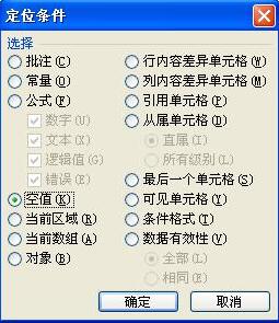 2.弹出“定位条件”对话框,选择“空值”,单击“确定”。