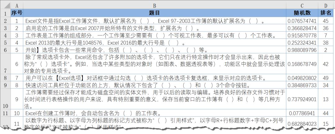 然后使用RANK函数得到这个随机数在所有随机数里的排名,这样就相当于是给每个题目后加了一个随机变化的序号。