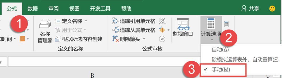 单击【公式】选项卡下的【计算选项】,在下拉菜单中选择【手动】: