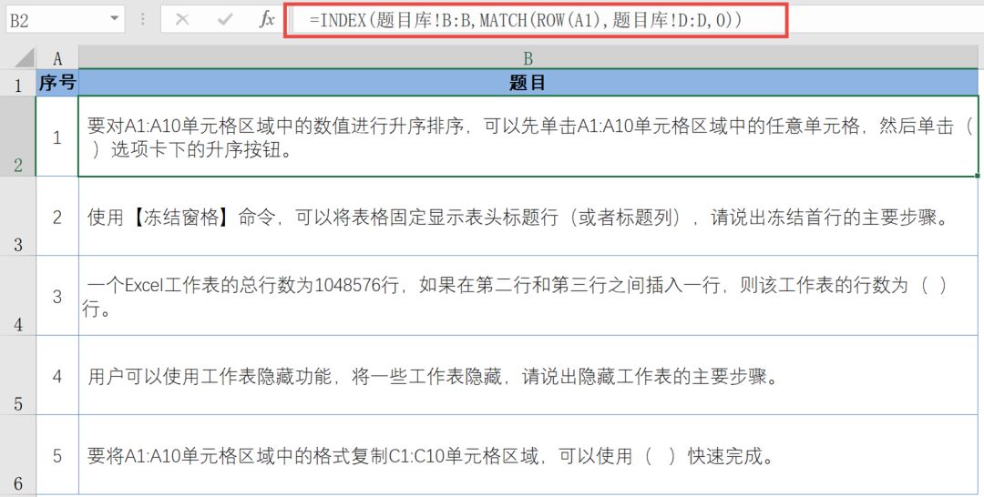 MATCH函数以这个序号作为查询值,在“题目库”工作表的D列中返回对应的位置信息,最后由INDEX函数根据这个位置信息,返回“题目库”工作表B列的内容。