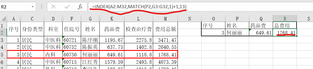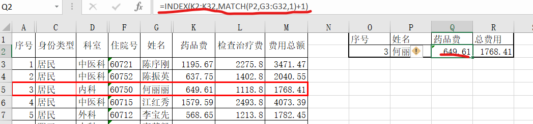 文章开头说过MATCH函数和INDEX函数是数据查找的CP,因此可以通过两个函数嵌套使用来查找数据。如通过病人姓名来查找病人的药品费用和总费用(注意总费用的查询用到了INDEX函数的列号参数)。