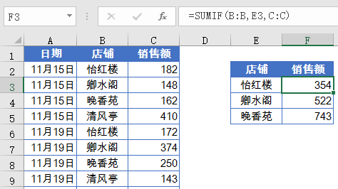 如下图所示,要统计不同门店的销售额。F3单元格公式为: